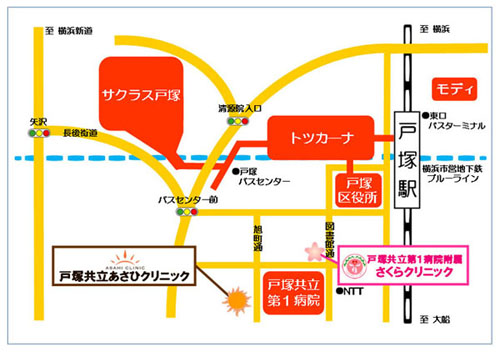 戸塚駅西口周辺には戸塚共立第1病院をはじめ、戸塚共立サクラスクリニック、戸塚共立おとキッズクリニック、戸塚共立メディカルサテライトクリニック、戸塚共立ステーションクリニック、戸塚共立訪問看護ステーションなど徒歩圏内に複数の施設がございます。